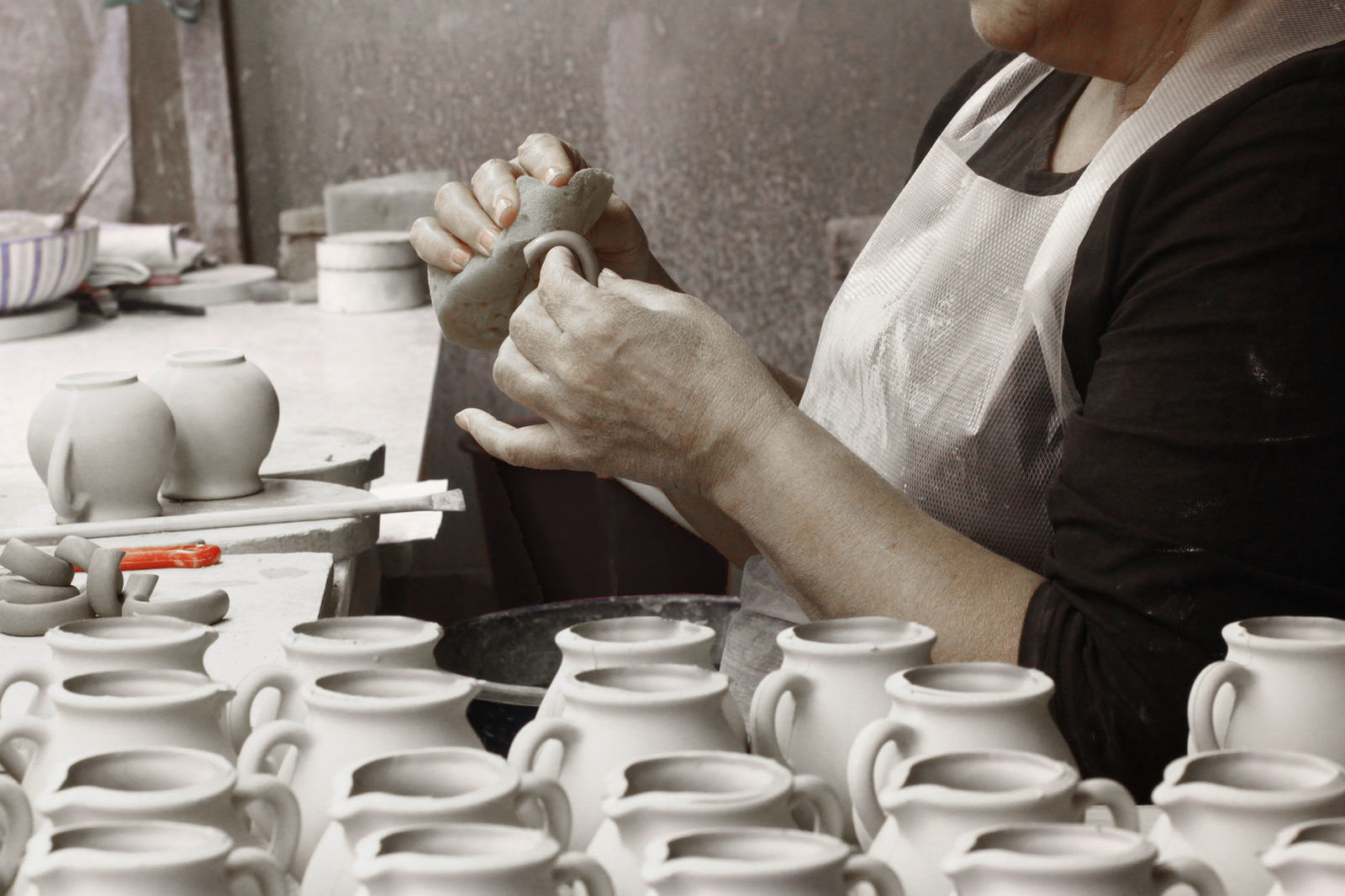 Rohe, lederharte Scherben erhalten bereits vor dem ersten Brennen eine dünnflüssige, schwarze Tonschicht, in die dann in filigraner Handarbeit die noch von Hedwig Bollhagen ausgebildeten Keramiker und Keramikerinnen die Dekore ritzen.