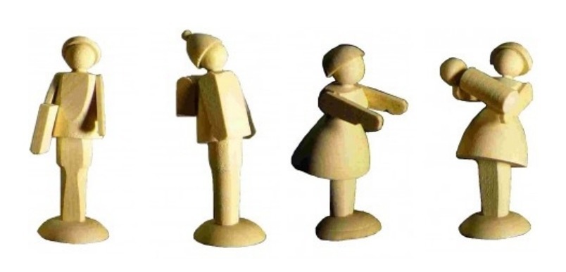 Die in Handarbeit produzierten Figuren aus Ahorn, entstehen aus mehreren Techniken, eine Kombination aus gedrechseltem Grundkörpern, geschnitten, geleimt, geschliffen und zusammengefügt .