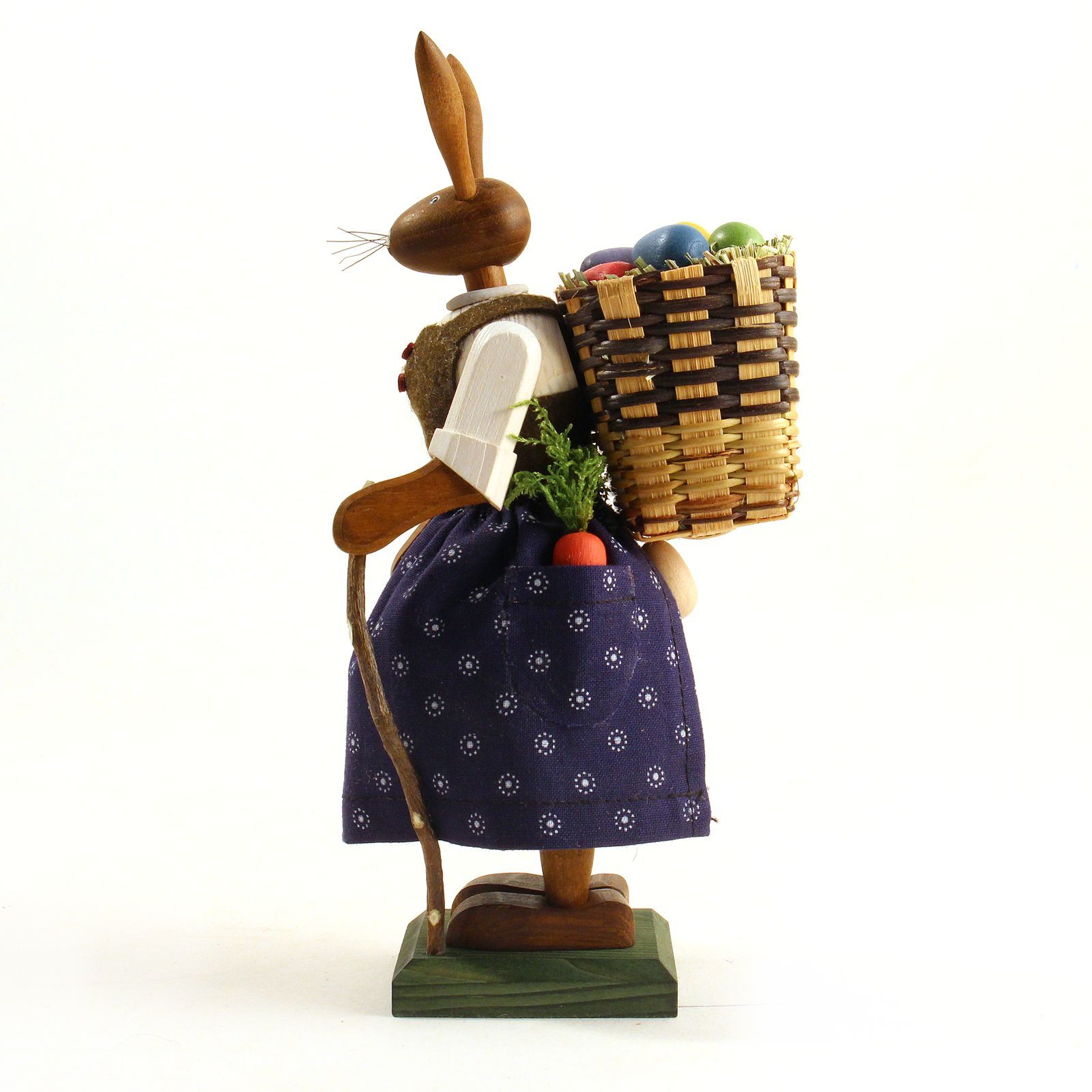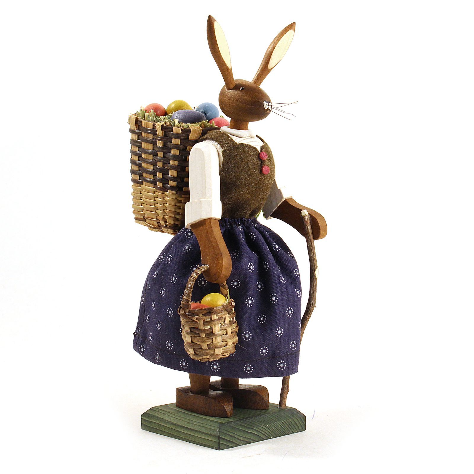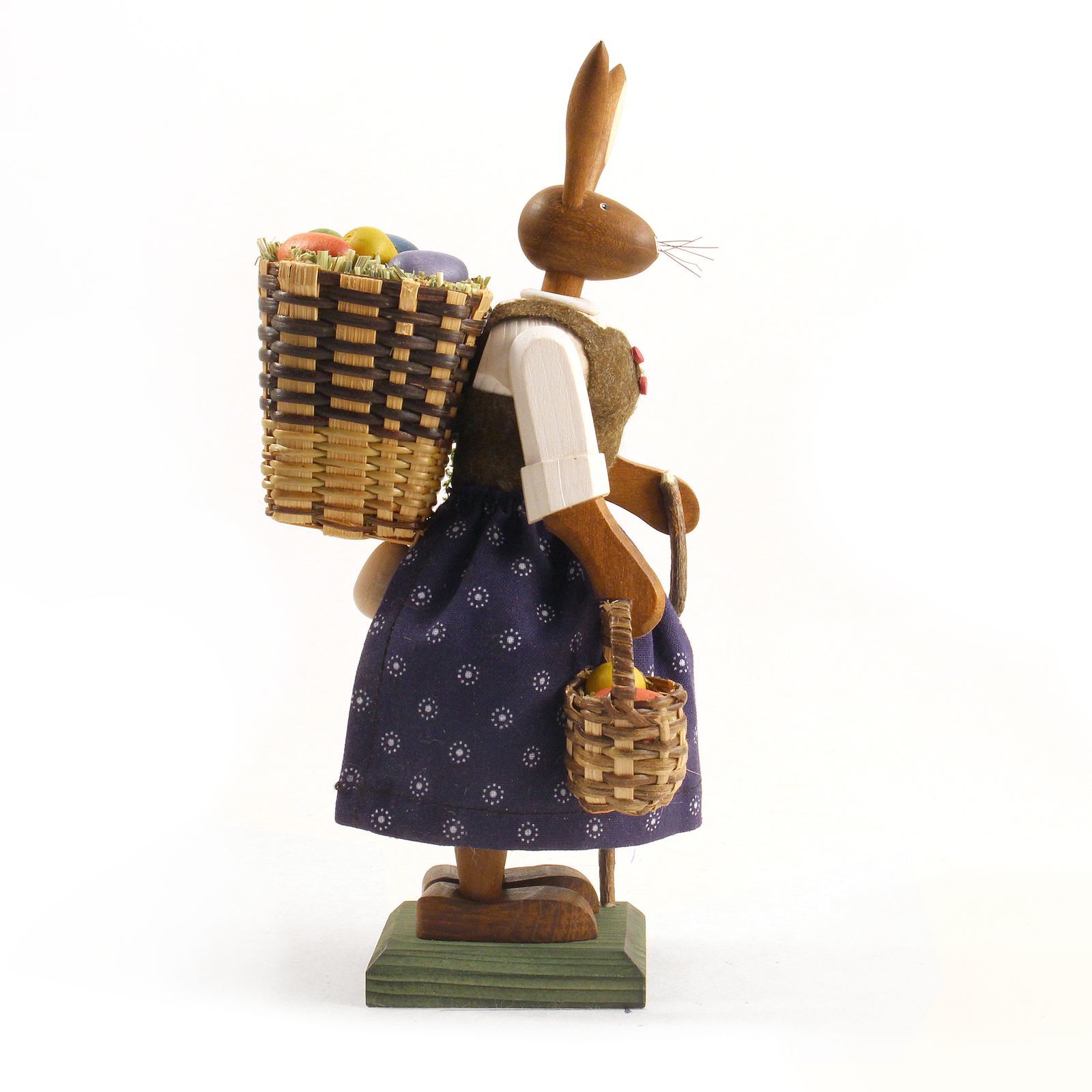 Diese wunderschöne Osterhasenfrau ist gestalterisch angelehnt an die bekannte "Häschenschule" und wird auch wie die Osterhasen aus Fichtenholz gedrechselt und beschnitzt. Alle Figuren sind das Ergebnis reiner Handarbeit. Bei der Farbgebung wird großer Wert darauf gelegt, die natürliche Schönheit des Holzes zu betonen, daher sind nur wenige Teile deckend bemalt. Ganz besonders auffallend und typisch sind die mit Liebe zum Detail gestalteten Accessoires. Der Rock ist in originalem Blaudruckverfahren gefärbt worden, Körbchen und Rückenstütze sind handgeflochten und die farbgebende Bemalung ist so sensibel angebracht, dass man die Strukturen des Holzes noch gut erkennen kann.