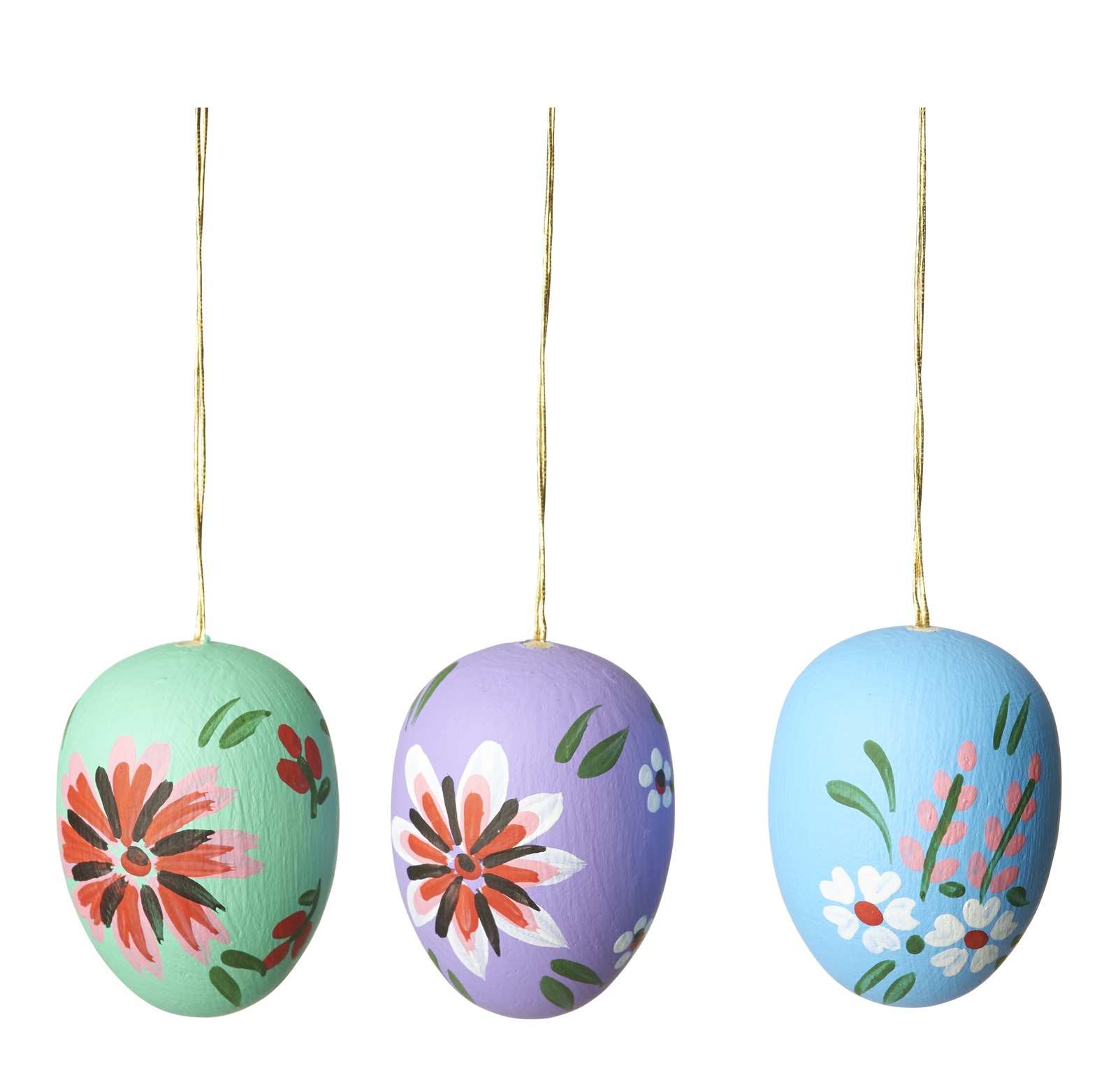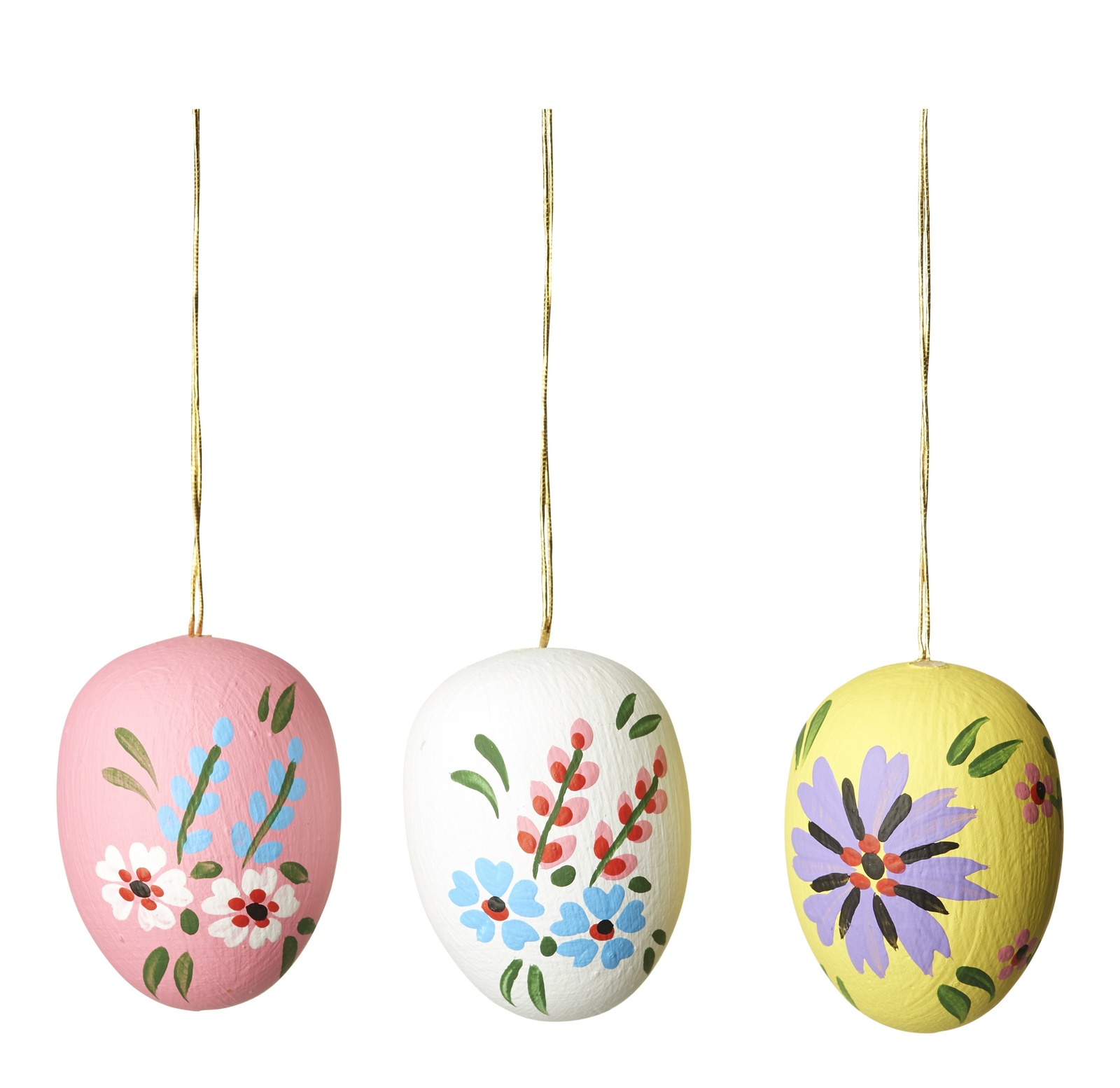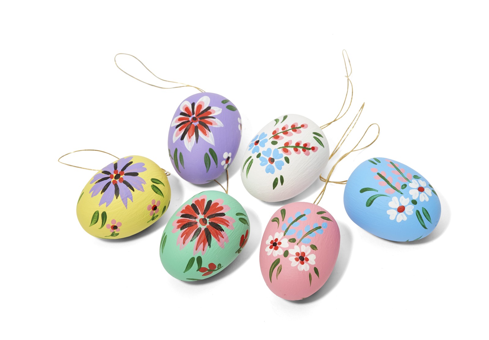 Der Osterschmuck ist jeweils mit einem Anhänger versehen. In der praktischen Pappbox finden Sie 6 unterschiedlich bemalte Eier.