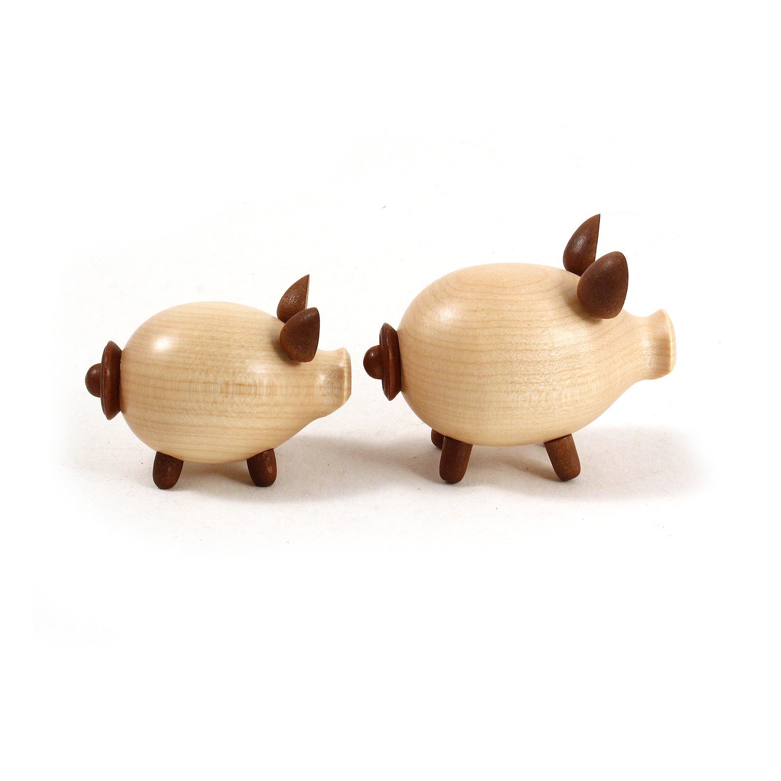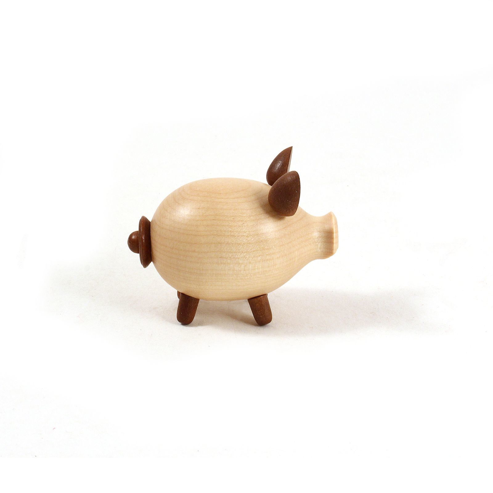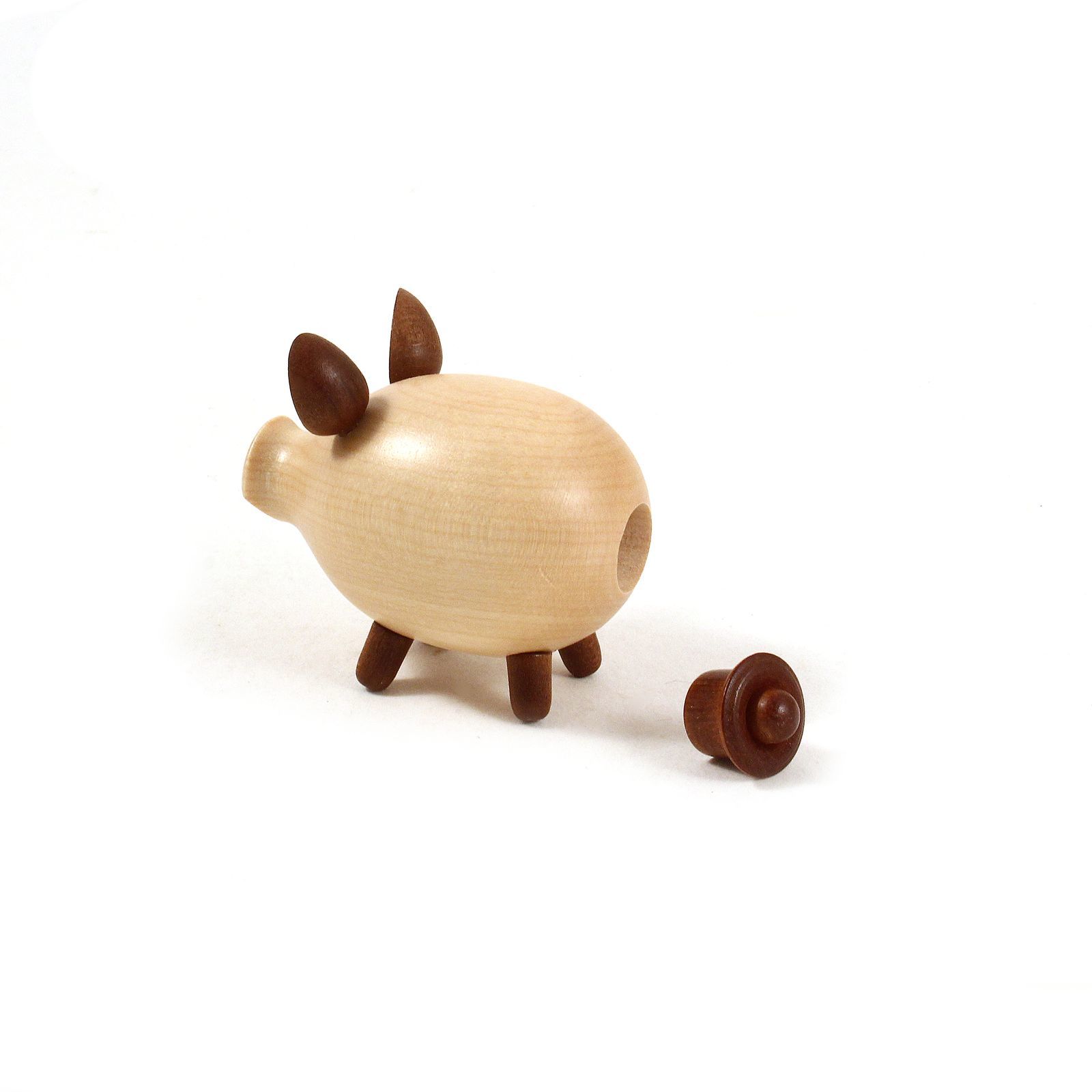 Die Schweinchengarnitur besteht aus einem Salz-und Pfefferstreuer sowie einem hölzernen Unterteller. Durch einen Verschluss am hinteren Ende kann Salz und Pfeffer eingefüllt werden. Das Holz ist von aussen lackiert und innen naturbelassen.