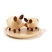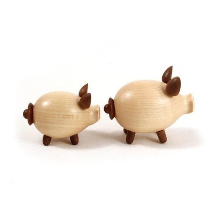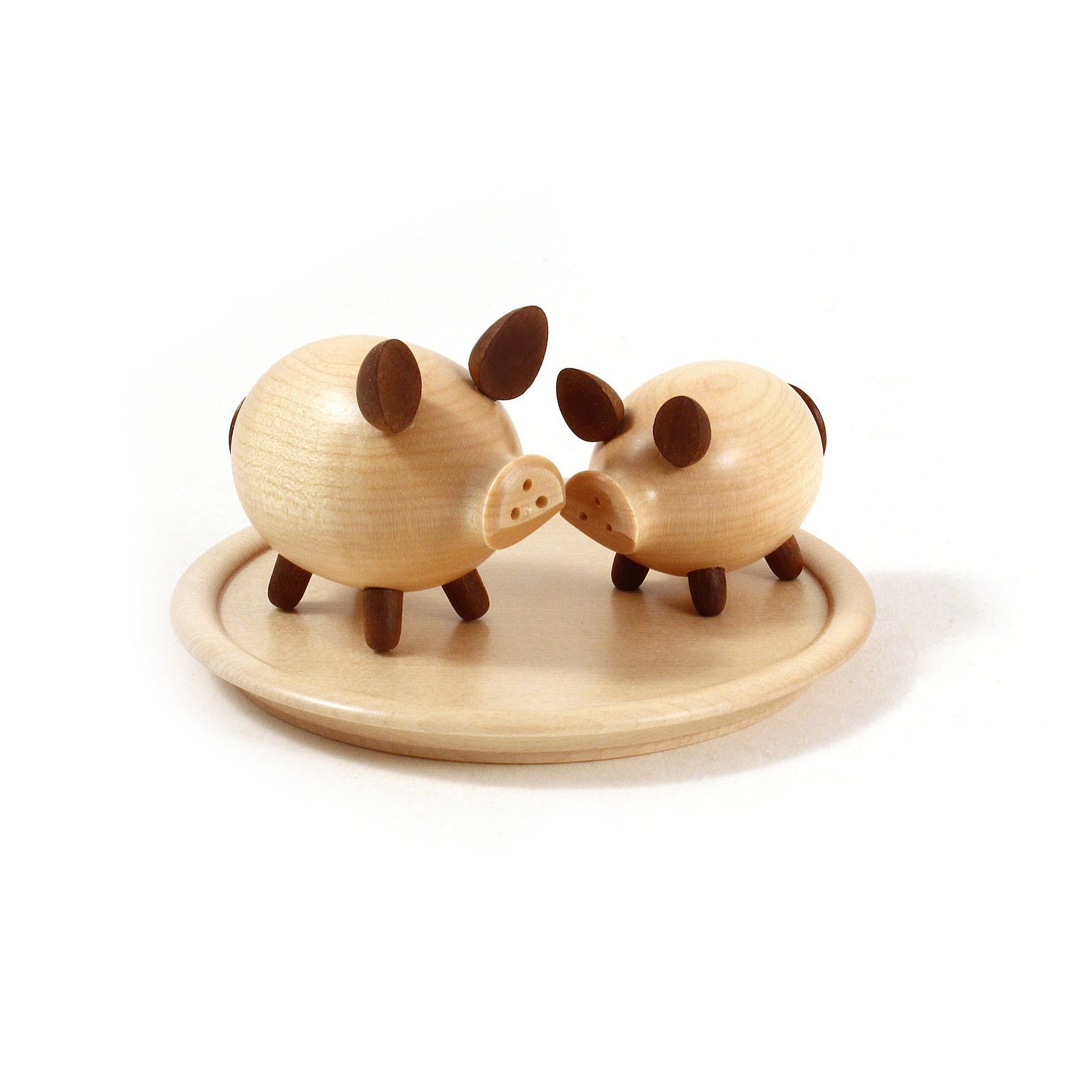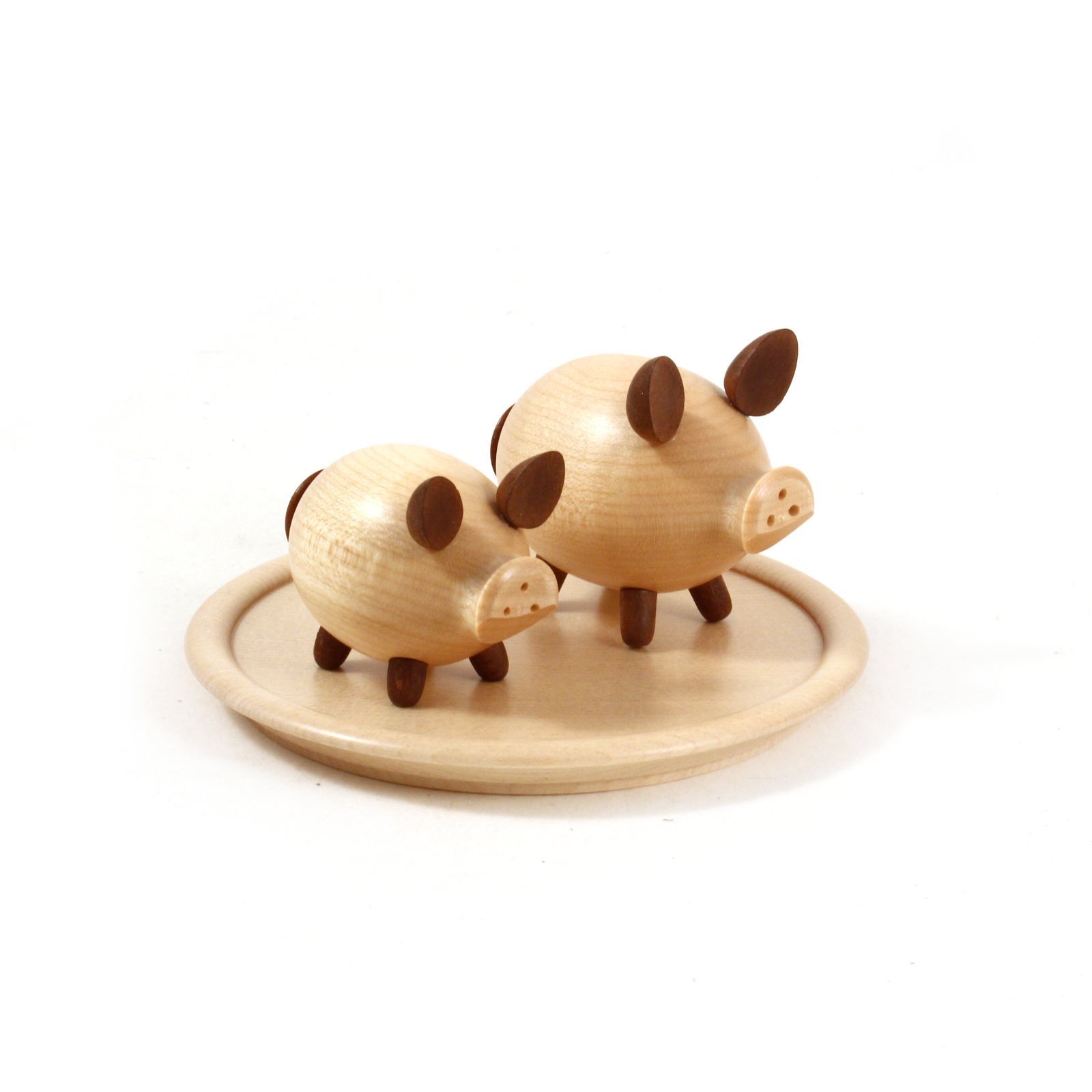 Die Schweinchengarnitur besteht aus einem Salz-und Pfefferstreuer sowie einem hölzernen Unterteller.