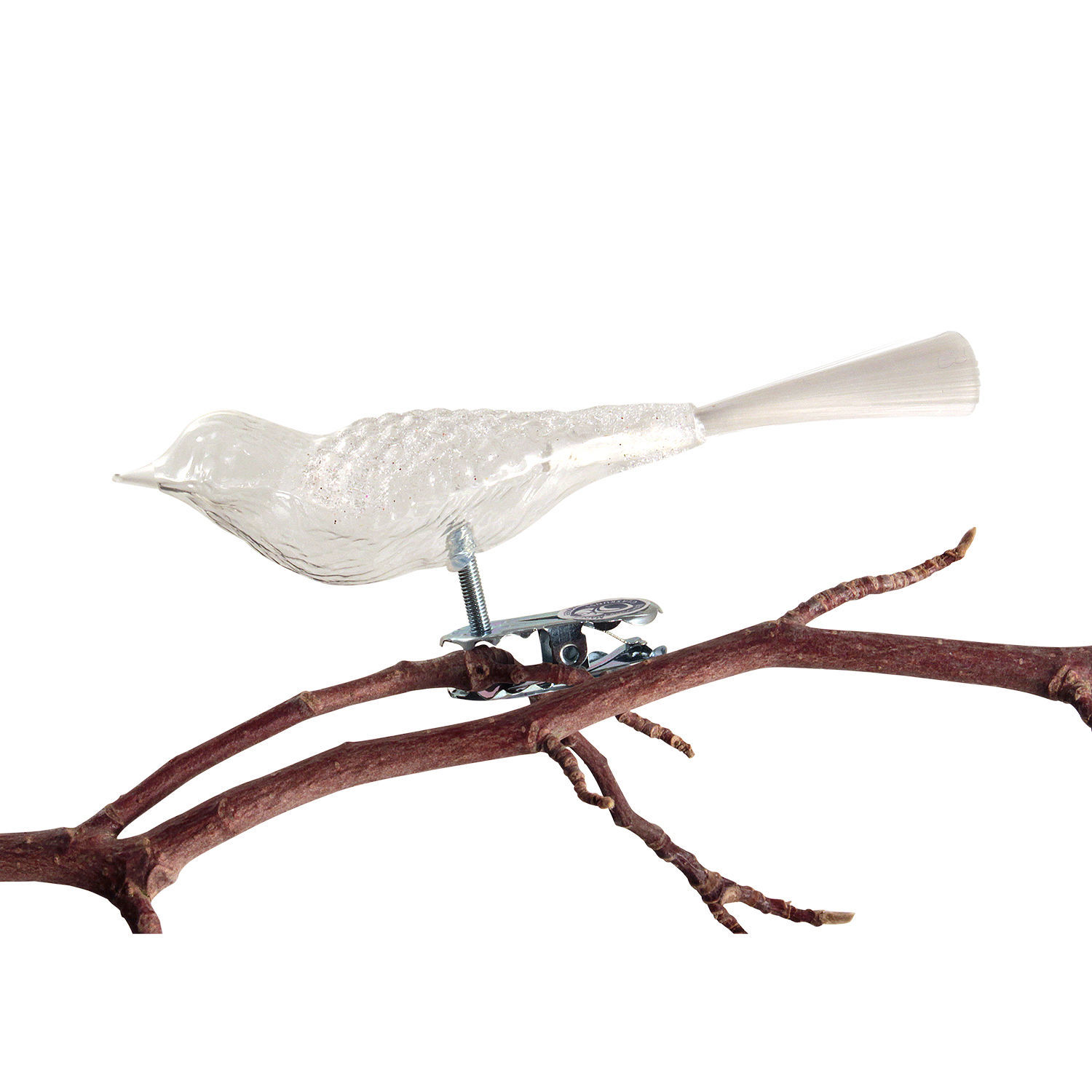 Von zerbrechlicher Ausstrahlung, trägt dieser Vogel das Waffelmuster, als eines der außergewöhnlichen Merkmale für Christbaumschmuck der 1920`iger Jahre, mit Schnee bedecktem Dekor auf dem Rücken. Überaus schön kombiniert wirkt er zusammen mit den gläsernen Kugeln von Wagenfeld.