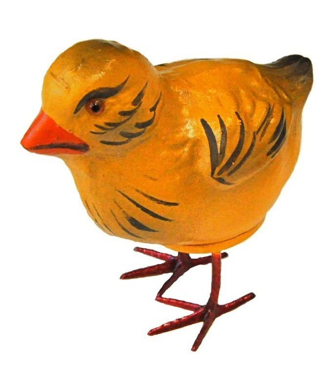 Die kunstvollen Papiermaché WERKE sind gerade unter Sammlern von historischen Papiermachéfiguren besonders beliebt. Außergewöhnlich schöne Formen wurden und werden über die Jahrzehnte aufbewahrt. Eine davon ist unser handgemaltes Küken mit Zinnfüssen und Glasaugen. Durch Drehen und Abnehmen des Körpers gelangen Sie in das Innere des Kükens. Beliebete Füllungen sind kleine Süßigkeiten. Sie können es verschließen, indem Sie dem Küken den Körper wieder aufstecken.