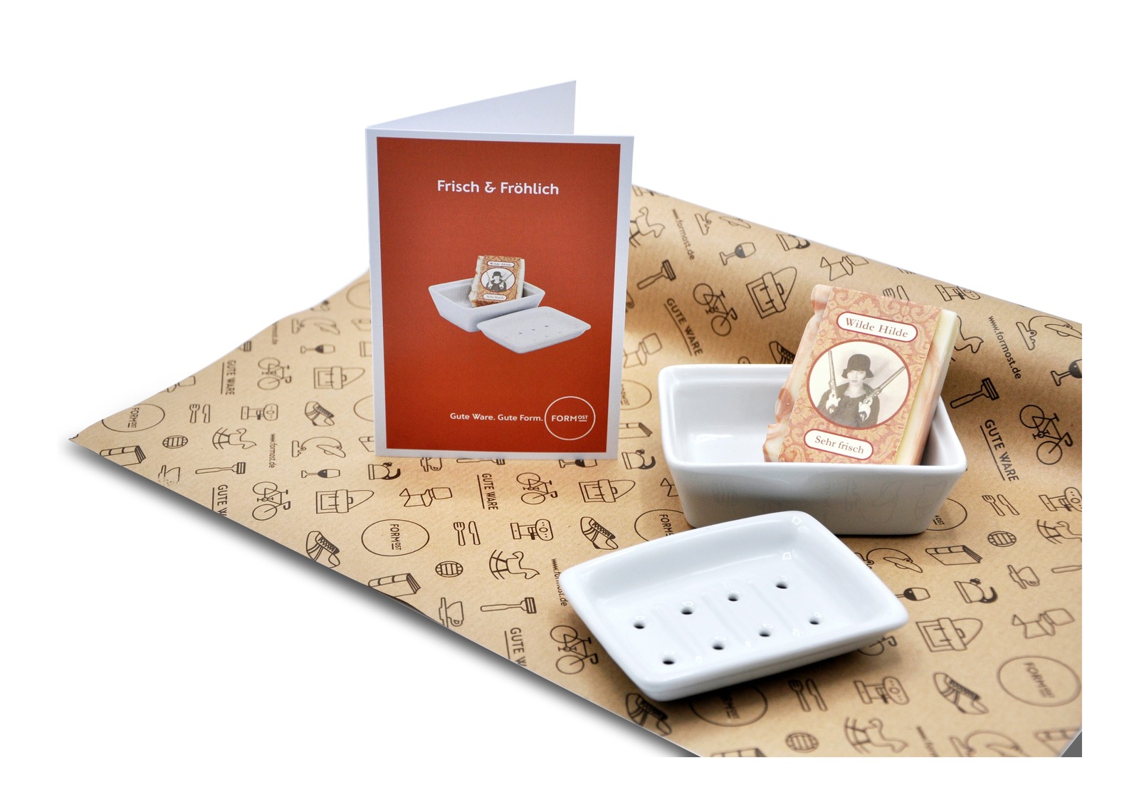 Exklusiv bei FORMOST - Das Geschenkset "Wilde Hilde" besteht aus einer Porzellan Seifenschale, einer Naturseife, einer Grußkarte mit Ihrem Text und unserer Formost Geschenkverpackung.