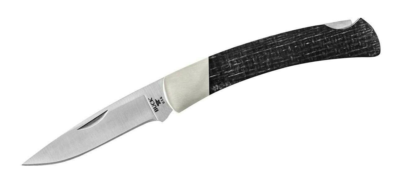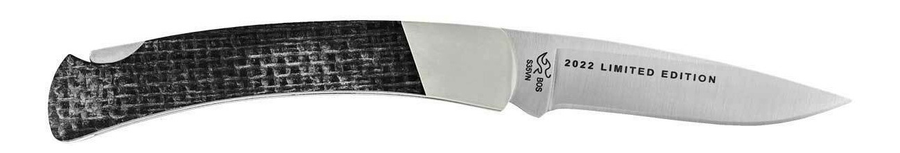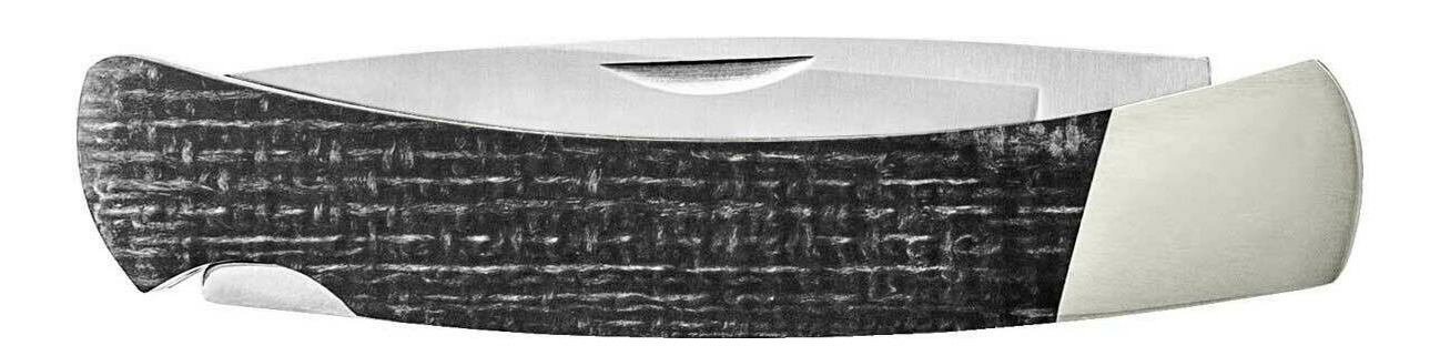 | Material | Satinierte Klinge aus S35VN rostfreiem Hochleistungsstahl, Griffstück aus schwarzen Leinensack-Micarta und Neusilberbacken eingefasst |
