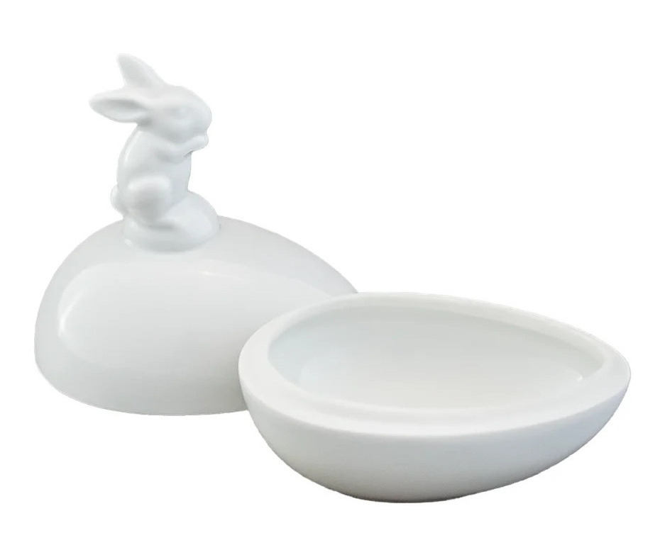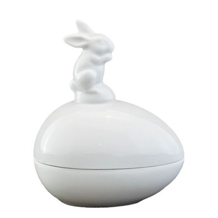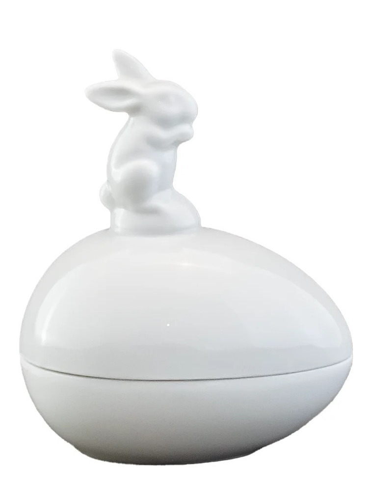 Die Osterdose in Form eines Eies mit einer Hasenfigur als Knauf ist eine entzückende und festliche Dekoration für die Osterzeit.