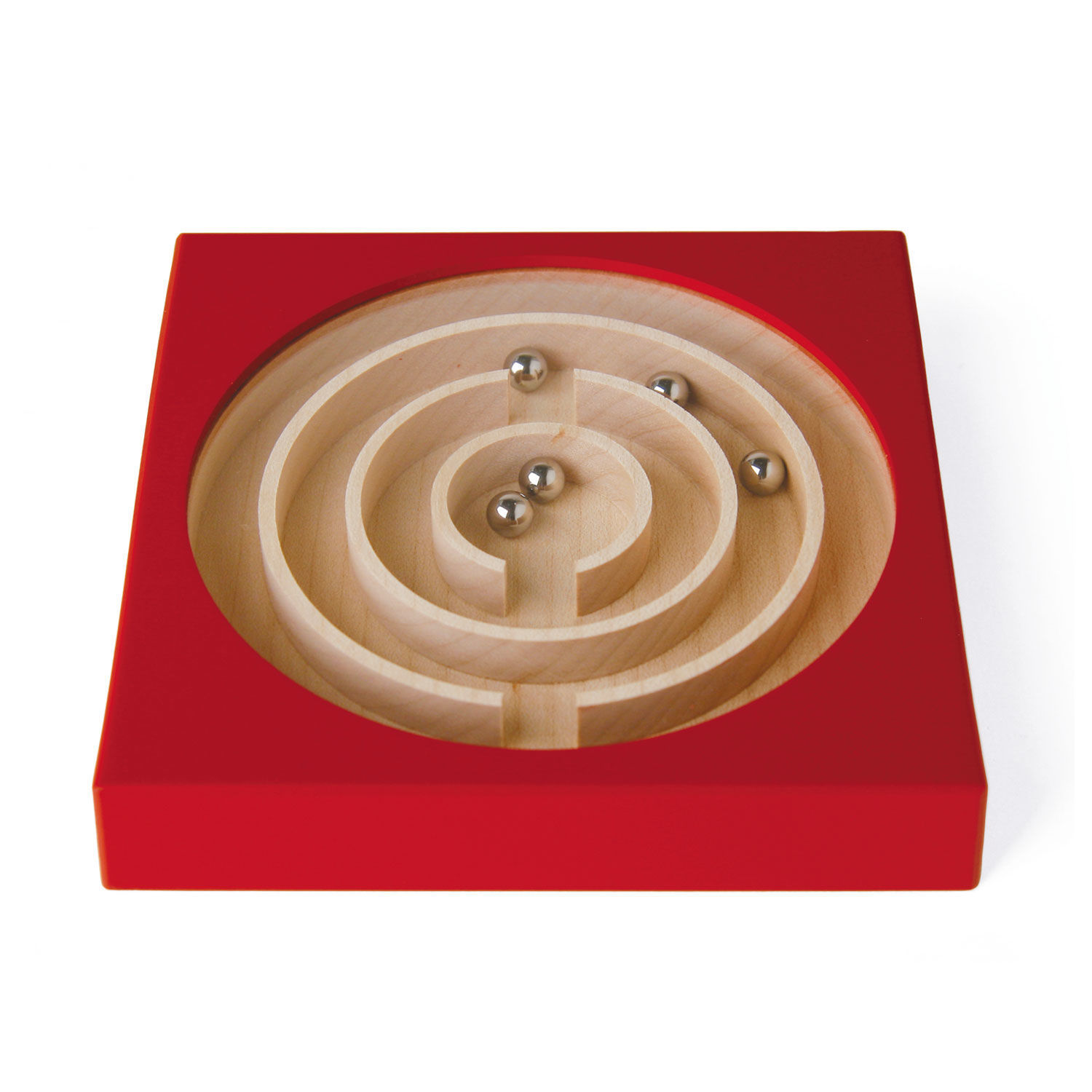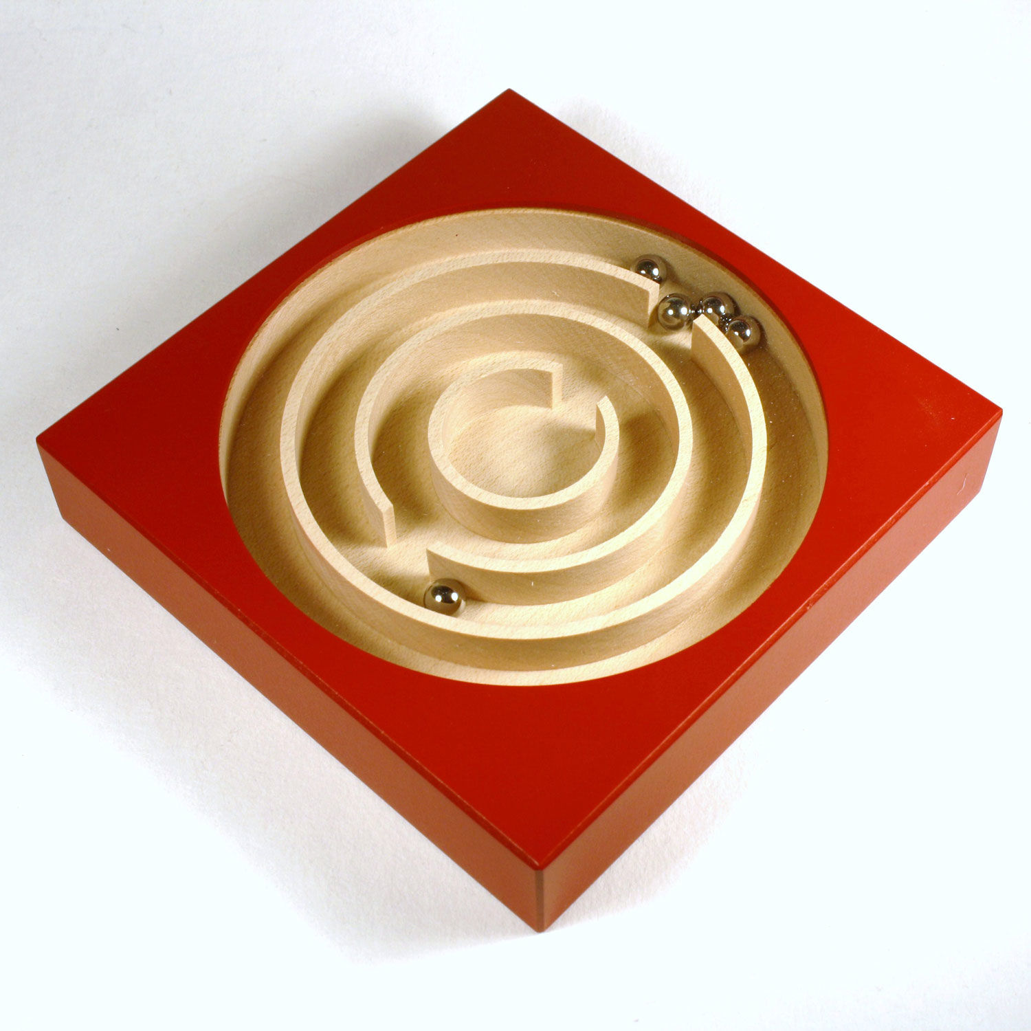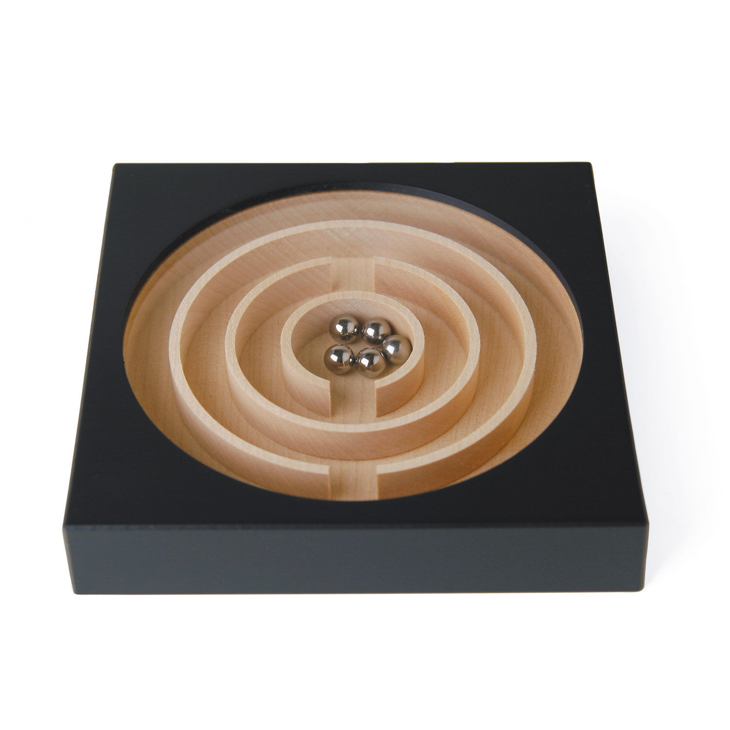 Alle fünf Stahlkugeln in das Innere des Labyrinths zu bringen, klingt einfacher als es ist, denn ist die Balance weg, zerstreuen sich die Kugeln. Ein Klassiker von Naef Spiele, der immer seine Faszination behält.