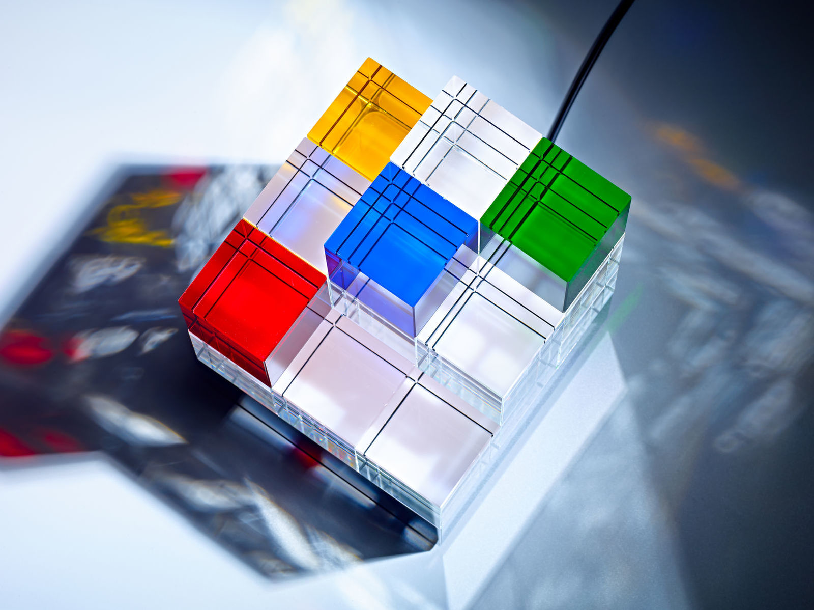 Auf dem quadratischen Edelstahlsockel liegen in einer Matrix angeordnete LEDs, deren dimmbares Licht sich von unten durch insgesamt 18 transparente und farbige Glaswürfel bricht. Die Würfel können frei und nach Belieben angeordnet werden.